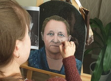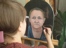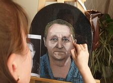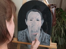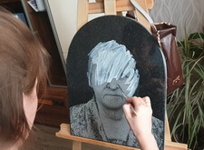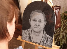 Сам же портрет наносится художником вручную. На приведённых ниже фото отображён поэтапный процесс рисования на граните: для начала камень покрывается специальной составом, затем медленно, начиная с одежды, вырисовываются детали. В заключении идёт углубление черт лица, так как без этого дополнения изображение на граните получится не реалистичным.