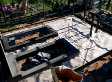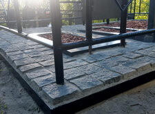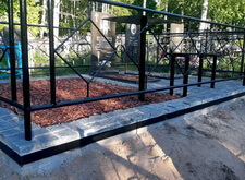 Уложив периметр, мы застелили территорию места захоронения геотекстилем, и выложили брусчатку вокруг памятников, предварительно установив лавочку со столиком.