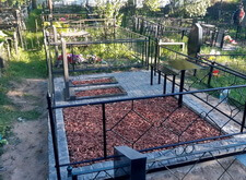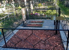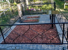 Дождавшись, пока покрытие высохнет, мы приступили к последней фазе работы. В цветники и специальную нишу, которую по желанию клиента не стали закладывать брусчаткой, засыпали мульчу. После этого протёрли памятники и ограждение. Могила готова, заказчик остался нами доволен.