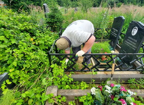 Уборка могилы с двумя памятниками